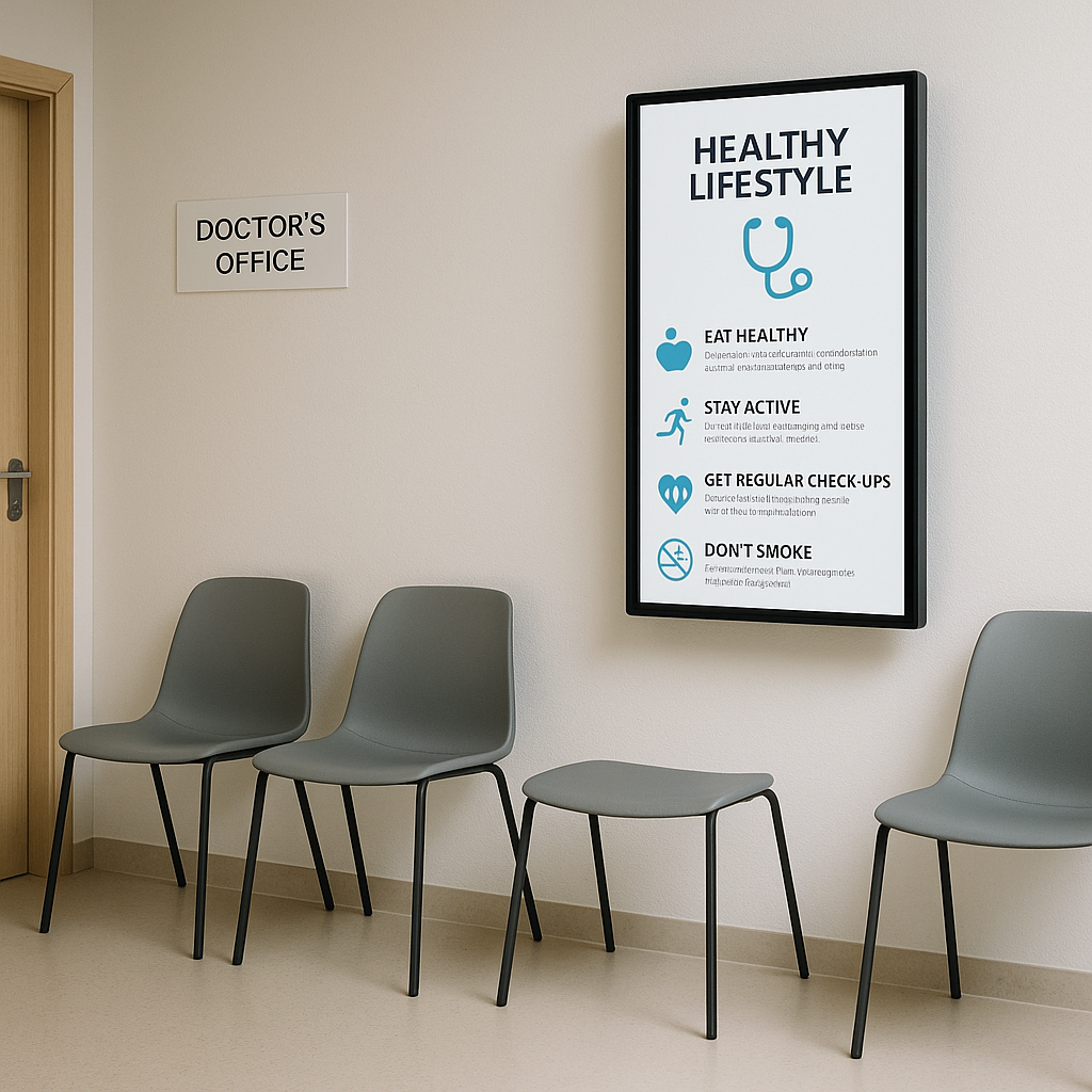 • W wiejskim ośrodku zdrowia ekran może służyć do przekazywania informacji o godzinach otwarcia oraz promowania sezonowych kampanii szczepień.
